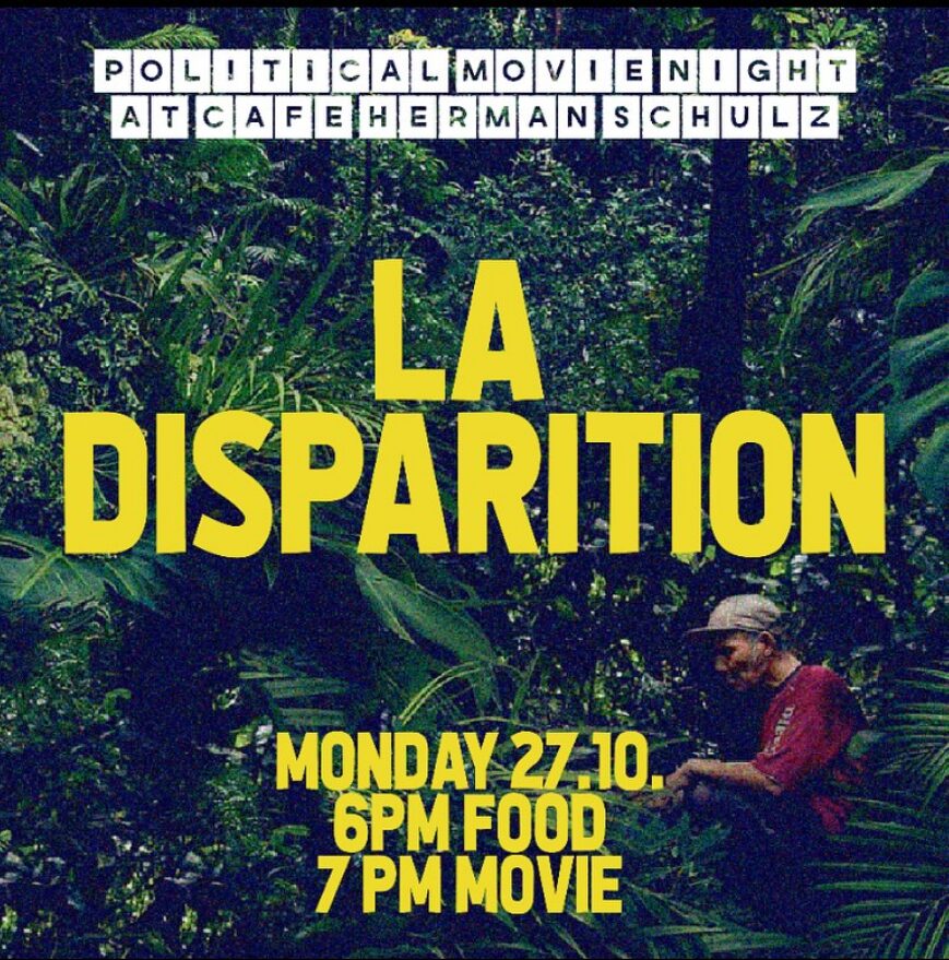 Am 27. Oktober wird im Café Hermann Schulz der Dokumentarfilm »La Disparition« (Das Verschwinden, Taushiro/Spanisch mit englischen Untertiteln) gezeigt. Der Film handelt von Amadeo, dem letzten der Taushiro im Norden Perus, tief im Amazonas. Der Film folgt ihm in seiner Einsamkeit und seinen Ritualen. Dabei entsteht ein größeres Narrativ der Zerstörung des Amazonas und des Verschwindens von indigenen Menschen und ihren Kulturen. Im Anschluss findet eine Diskussion statt. Vor dem Film gibt es peruanisches Essen.