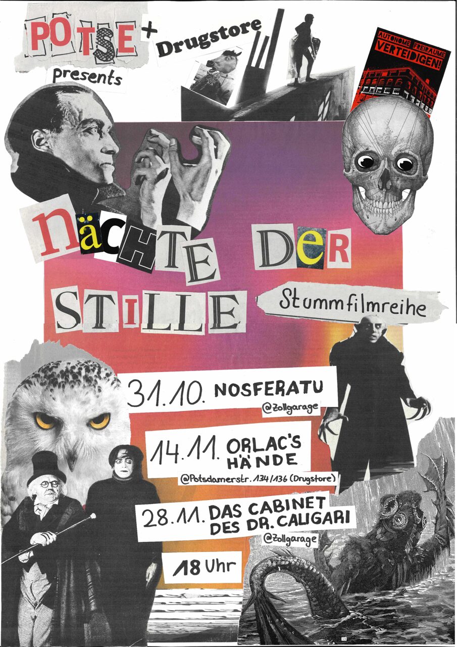 Die Tage werden kürzer, die Nächte werden länger. Passend zum Anlass laden die selbstverwalteten Jugendzentren Potse und Drugstore zu drei Klassikern des expressionistischen Stummfilms ein: Los gehts an Halloween mit einem Film zum Gruseln: Am Freitag, 31. Oktober, läuft »Nosferatu – Eine Symphonie des Grauens« (1922) in der Zollgarage (Flughafen Tempelhof). Zwei Wochen später, am 14. November, wird »Orlacs Hände« (1924) im Drugstore (Potsdamer Straße 134) gezeigt. Und am Freitag, den 28. November, gibt es »Das Cabinet des Dr. Caligari« (1920) in der Zollgarage zu sehen. Jeweils um 18 Uhr gehts los. Eintritt frei! Die Räume sind rauchfrei.