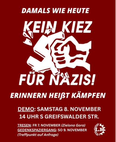 Dieses Jahr jährt sich zum 87. Mal die Reichspogromnacht. In der Nacht vom 9. auf den 10. November 1938 griffen bewaffnete Nazitrupps die Orte jüdischen Lebens in Deutschland an. Synagogen wurden in Brand gesteckt, jüdisch geführte Geschäfte zerstört und in Folge rund 26.000 Menschen in Konzentrationslager verschleppt. Viele von ihnen kamen dabei zu Tode. Wie vor 87 Jahren werden Faschisten immer präsenter in der Nachbarschaft und rechtes Gedankengut wird immer mehr zur Norm. Durch die rechte sowie menschenfeindliche Poltik und Propaganda in der bürgerlichen Öffentlichkeit inszenieren sich Neonazis in Berlin immer öffentlicher und gewaltbereiter. Deshalb findet die diesjährige „Kein Kiez für Nazis"-Demonstration als kämpferische Gedenkdemo in Verbindung mit einem Gedenkwochenende statt.